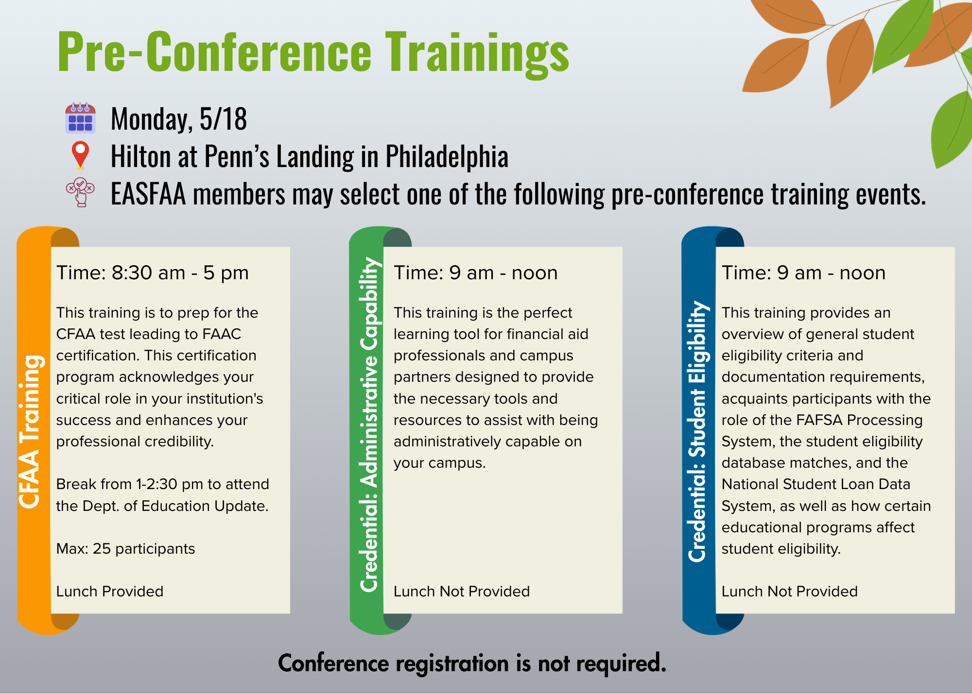 1. Please check the date on the EASFAA calendar to verify if the date is free of other activities. 2. Please have requested date, session topic/title, description, presenter, and presenter bio information ready upon requesting the training. 3. Complete the Training Session Request Form found below. Once submitted the Tuesday @ 2 chairs will review your request and be in touch.